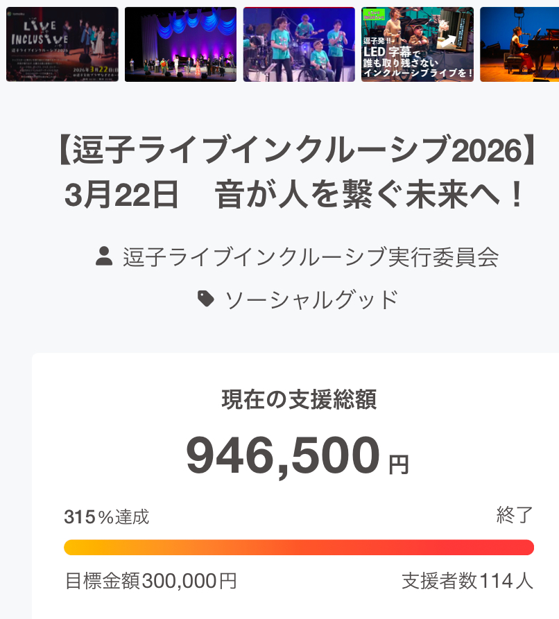 逗子ライブインクルーシブ2026のクラウドファンディングが、無事に終了しました。