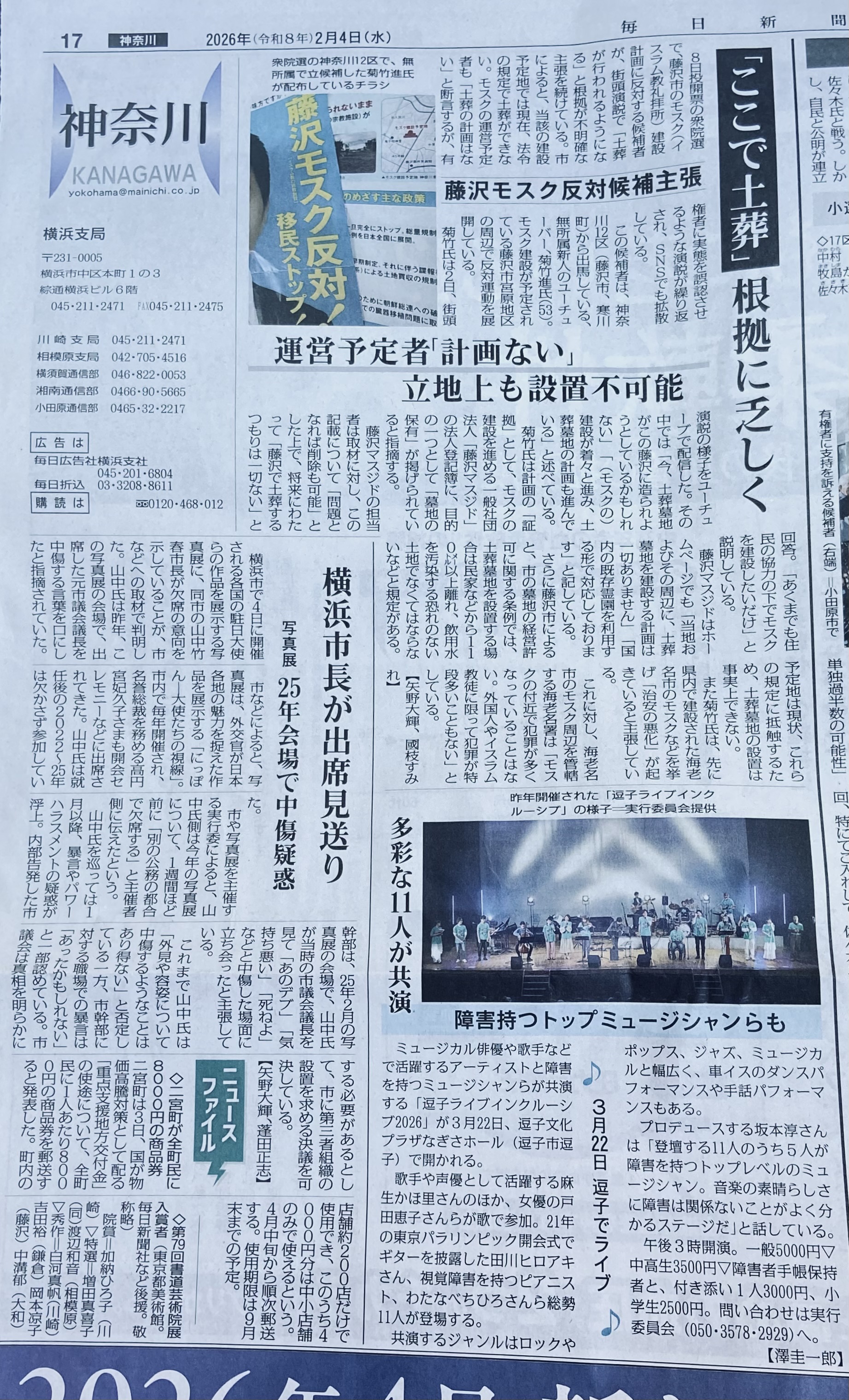 毎日新聞社様、神奈川版に取り上げていただきました。